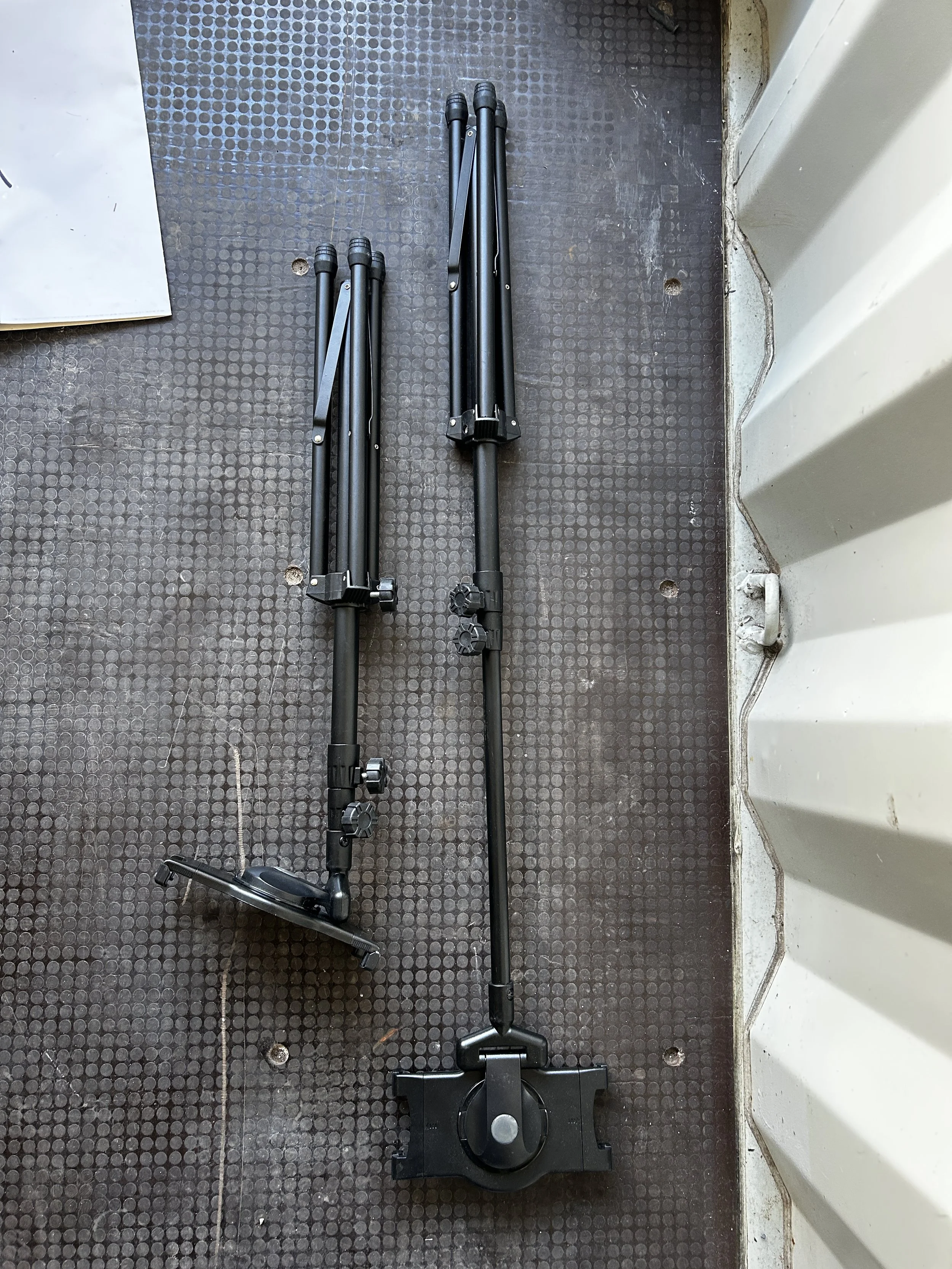 Pair of sturdy adjustable desk-mounted microphone arms, perfect for podcasting, streaming, or recording. These clamp securely to a desk or table and can hold a range of microphones or accessories.